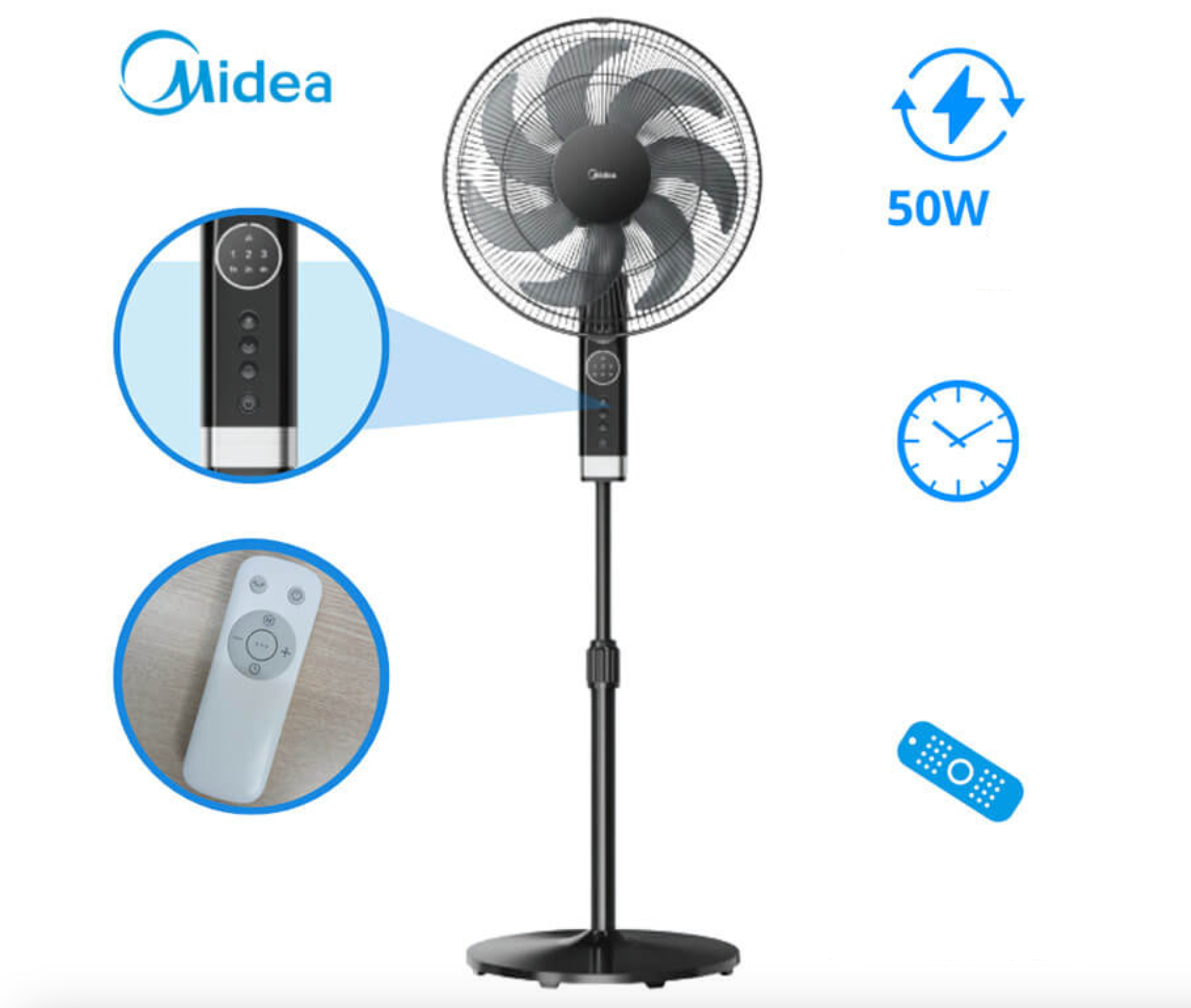 MIDEA VENTILATEUR A PIED 16" - NOIR - 50W - 3 VITESSES - 7 HELICES